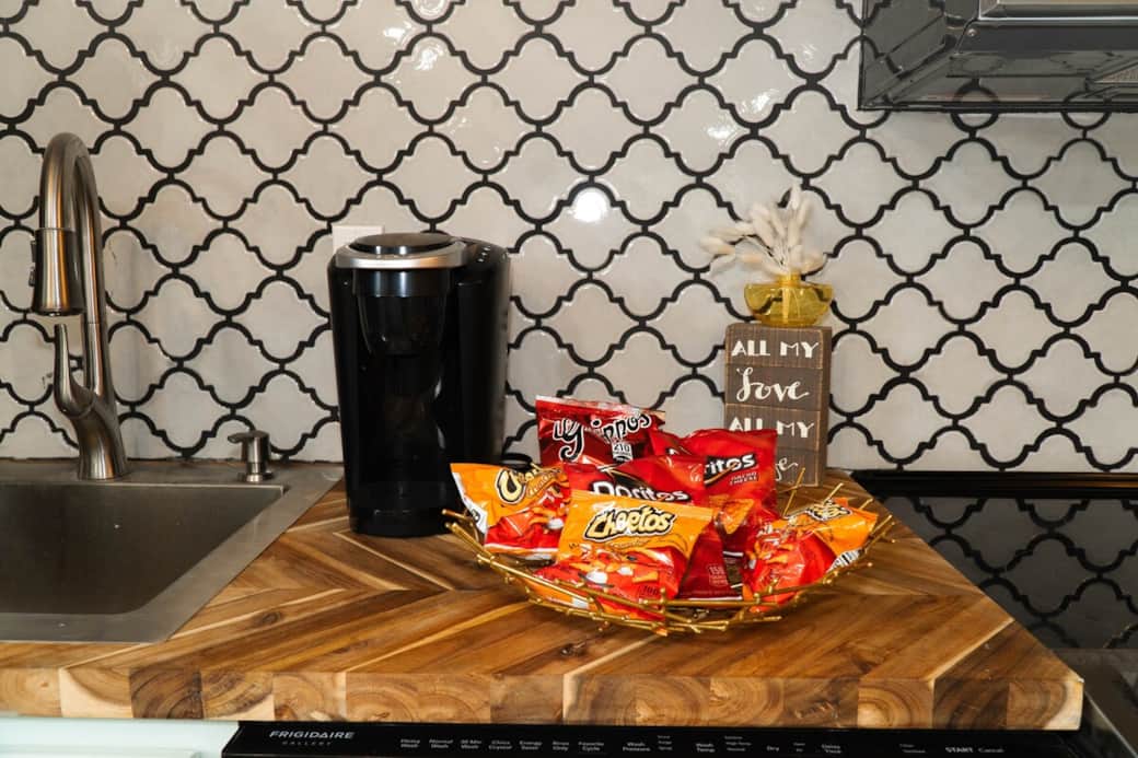 Kitchen, Coffee machine, Dishwasher, Kitchen stove, Microwave, Oven, Refrigerator, Toaster, Cleaning Products, Baking sheet, Coffee, Cooking basics, Dining table, Dishes and silverware, Freezer, Trash compactor, Wine glasses